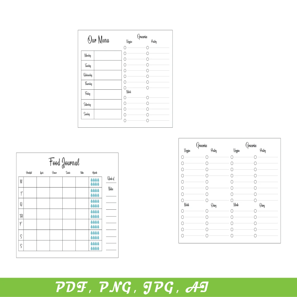 Printable Menu Planner Bundle with Grocery List printable, Food Journal, Grocery List, Simple, clean, modern design, layout printable